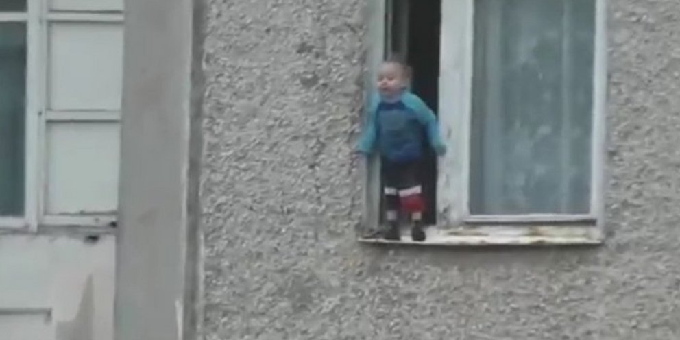Ενα μωρό έχει βγει από το παράθυρο του σπιτιού του και στέκεται στον ακάλυπτο χώρο της πολυκατοικίας από τον 8ο όροφο. Κάποια στιγμή δείχνει να χάνει την ισορροπία του όμως κατορθώνει να κρατηθεί χωρίς να καταλαβαίνει φυσικά τον κίνδυνο που διατρέχει.