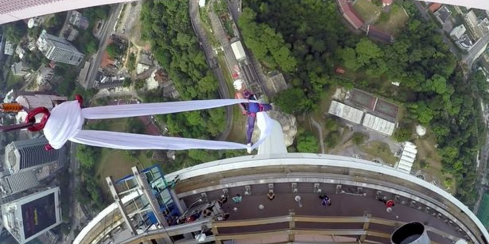 Ενας ακροβάτης κρεμάστηκε με σχοινιά στην Κουάλα Λουμπούρ της Μαλαισίας, αλλά «πάγωσε» άπαντες.