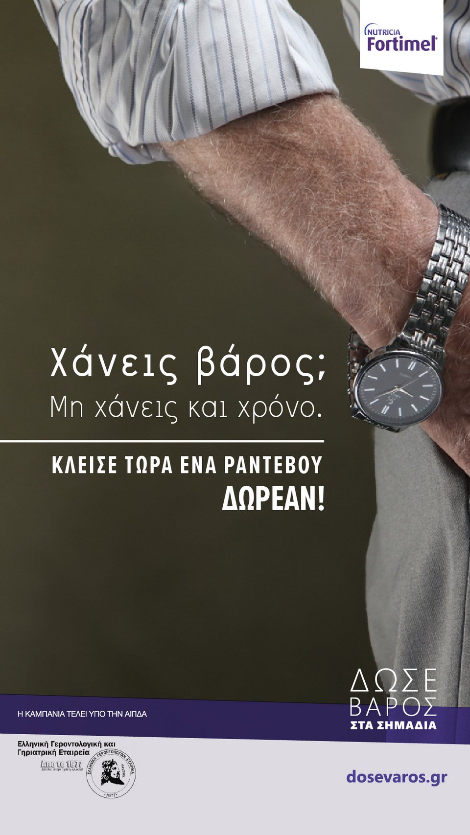 Το Fortimel της Nutricia και η Ελληνική Γεροντολογική και Γηριατρική Εταιρεία, στα πλαίσια της καμπάνιας ευαισθητοποίησης για τα άτομα τρίτης ηλικίας, σε καλούν για έναν δωρεάν έλεγχο της κατάστασης θρέψης σου από εξειδικευμένους επαγγελματίες υγείας. Ενημερώσου έγκυρα - είτε αφορά εσένα, είτε κάποιον αγαπημένο σου - και μάθε τα πάντα για τα συμπτώματα και τη σωστή αντιμετώπιση της δυσθρεψίας.