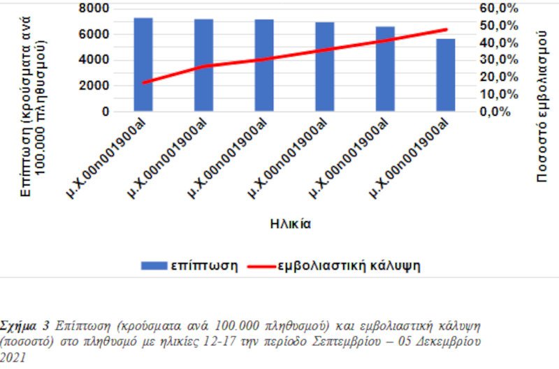 Ο ΕΟΔΥ σημειώνει ότι το 2020 υπήρχαν συνολικά 4.300 κρούσματα στην ηλικιακή ομάδα των παιδιών 13-17 ετών, εκ των οποίων 3 παιδιά χρειάστηκαν διασωλήνωση και σημειώθηκαν 3 θάνατοι. Το έτος 2021, σε αυτήν την ηλικιακή ομάδα σημειώθηκαν 73.479 κρούσματα, εκ των οποίων μόλις το 3,2% (2.344 κρούσματα) αφορούσε εμβολιασμένα παιδιά και το υπόλοιπο 96,8% (71.135 κρούσματα) ανεμβολίαστα παιδιά, ενώ σημειώθηκαν 8 διασωληνώσεις αποκλειστικά σε ανεμβολίαστα παιδιά. Στα εμβολιασμένα άτομα αυτής της ηλικιακής ομάδας σημειώθηκαν μόλις οι 3 από τις συνολικά 516 νοσηλείες σε απλή κλίνη νοσοκομείου (το 0,58% δηλαδή του συνόλου των νοσηλειών) έναντι 513 νοσηλειών σε ανεμβολίαστα παιδιά, ενώ δεν σημειώθηκε κανένας θάνατος στα συνολικά 2.344 κρούσματα των εμβολιασμένων παιδιών.