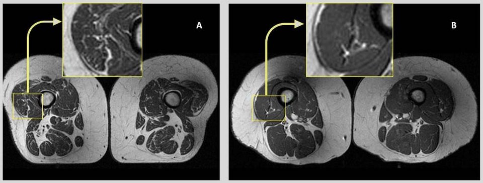 - Εικόνες μαγνητικής τομογραφίας από τις πλευρικές πτυχές των τετρακέφαλων μηριαίων μυών δύο γυναικών που συμμετείχαν στη μελέτη, ηλικίας 58 (Α) και 62 ετών (Β).