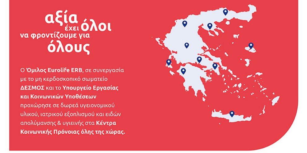 Ο ασφαλιστικός όμιλος Eurolife ERB, σε συνεργασία με το μη κερδοσκοπικό σωματείο ΔΕΣΜΟΣ και το Υπουργείο Εργασίας και Κοινωνικών Υποθέσεων, προχώρησε στη δωρεά υγειονομικού υλικού, ιατρικού εξοπλισμού και ειδών απολύμανσης και υγιεινής στα Κέντρα Κοινωνικής Πρόνοιας σε όλη την Ελλάδα.
