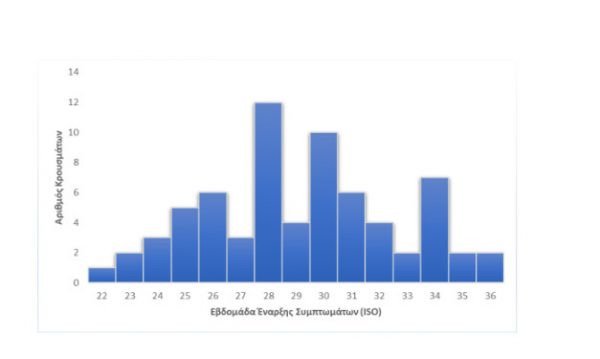 Η χρονική κατανομή των εργαστηριακά επιβεβαιωμένων κρουσμάτων ανά εβδομάδα έναρξης συμπτωμάτων (εβδομάδα κατά ISO) παρουσιάζεται στο παρακάτω Γράφημα.