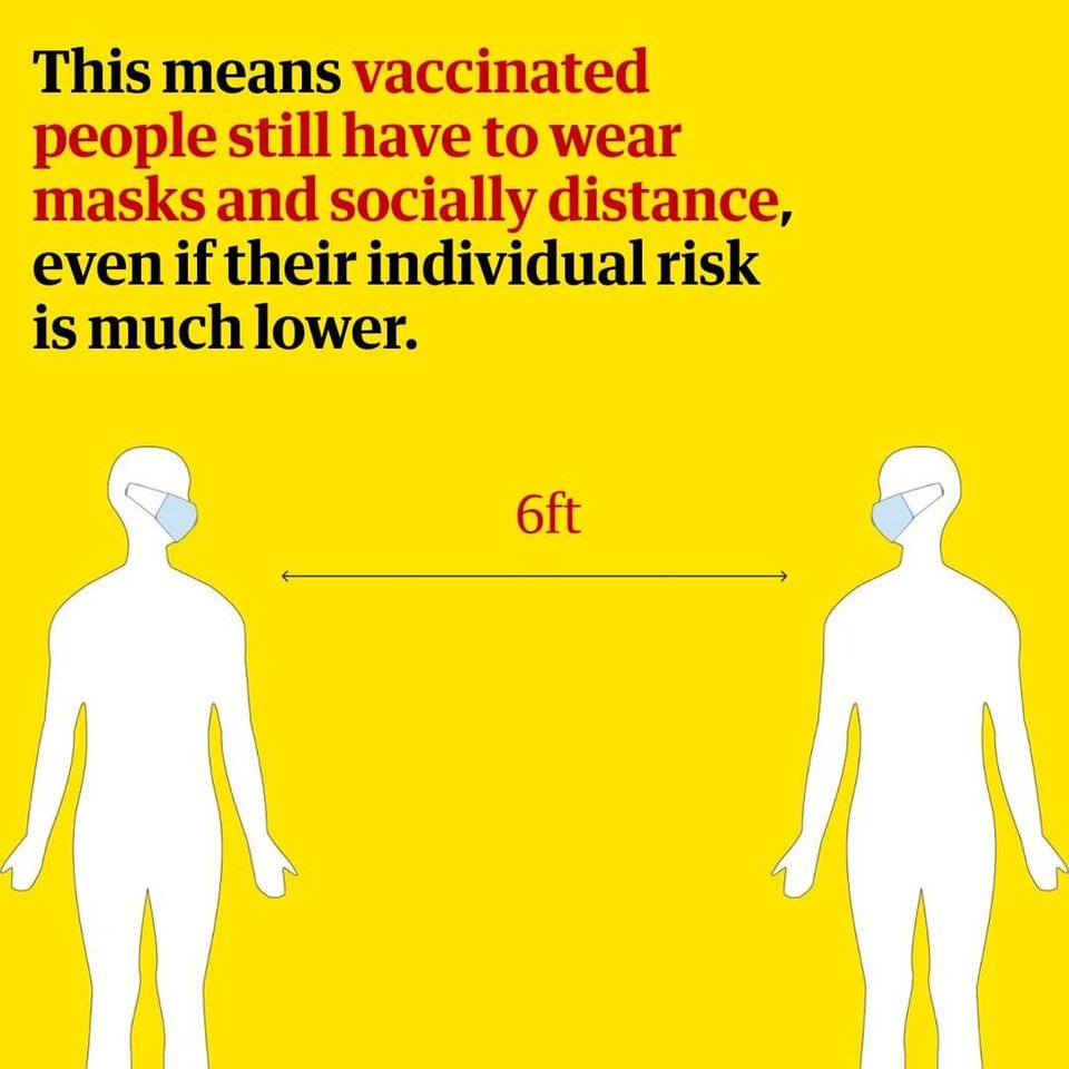 Αυτό σημαίνει ότι οι εμβολιασμένοι θα πρέπει να συνεχίσουν να τηρούν τις κοινωνικές αποστάσεις και να φορούν μάσκα ακόμη και αν το προσωπικό τους ρίσκο είναι πολύ χαμηλότερο.