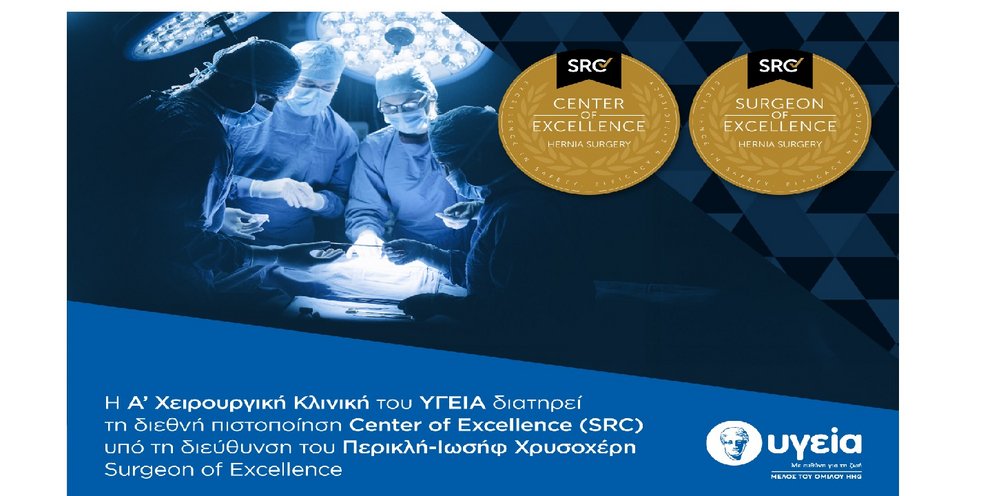 Η Α’ Χειρουργική Κλινική του ΥΓΕΙΑ διατηρεί, έπειτα από αξιολόγηση, τη διεθνή διάκριση Κέντρου Αριστείας (Center of Excellence) από τον Διεθνή Μη Κερδοσκοπικό Οργανισμό Surgical Review Corporation (SRC), για τη χειρουργική αποκατάσταση κηλών κοιλιακού τοιχώματος και διαφράγματος, επιβεβαιώνοντας με συνέπεια την υψηλή εξειδίκευση και την ποιότητα των παρεχόμενων υπηρεσιών της.