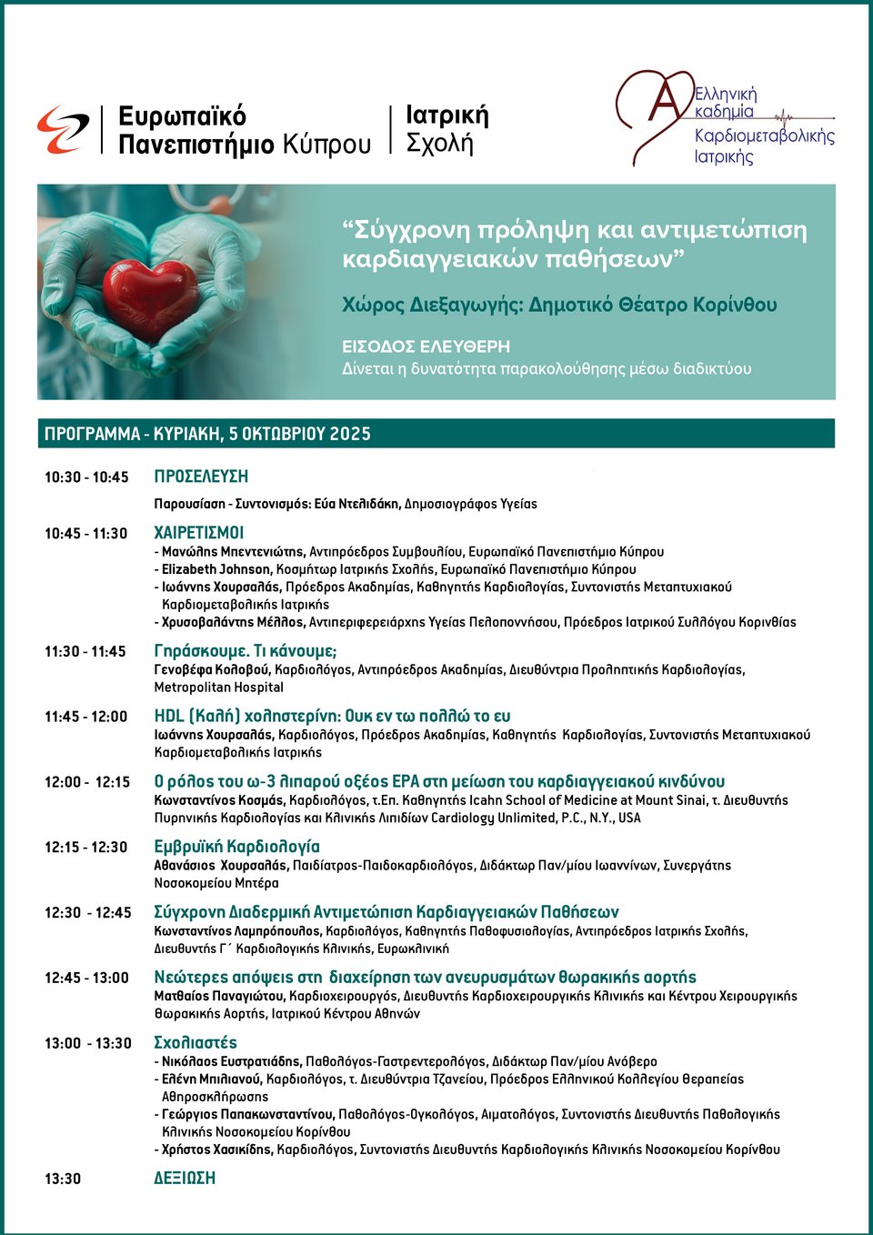 Η Ιατρική Σχολή του Ευρωπαϊκού Πανεπιστημίου Κύπρου και η Ελληνική Ακαδημία Καρδιομεταβολικής Ιατρικής, διοργανώνουν από κοινού Ημερίδα, με γενικό τίτλο: «Σύγχρονη πρόληψη και αντιμετώπιση καρδιαγγειακών παθήσεων».