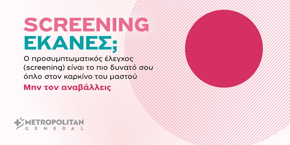 Μήνας Πρόληψης και Ενημέρωσης για τον Καρκίνο του Μαστού ο Οκτώβριος, με το θεραπευτήριο Metropolitan General να προσφέρει διάφορα πακέτα ελέγχου μαστού.