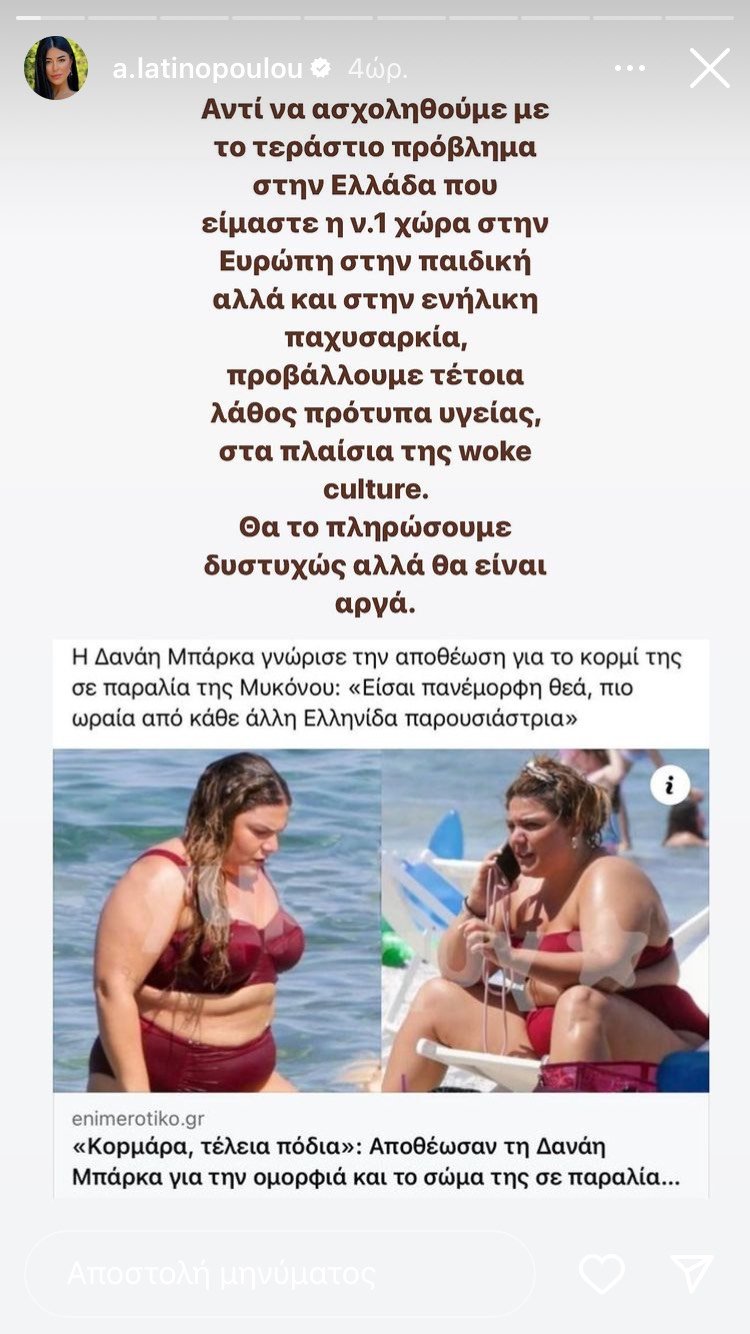 Η Λατινοπούλου αυτή τη φορά σχολίασε το γεγονός ότι η Μπάρκα ανέβασε φωτογραφία με μαγιό και εισέπραξε θετικά σχόλια, δηλώνοντας ότι προβάλλουμε λάθος πρότυπα ενήλικης παχυσαρκίας.