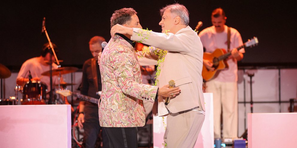 Ο γνωστός τραγουδιστής ήταν καλεσμένος στην παράσταση «Ταράτσα του Φοίβου» στο Θέατρο Άλσος, με τον τραγουδοποιό να τον υποδέχεται με μια ζεστή αγκαλιά, λίγο πριν ξεκινήσουν να τραγουδάνε.