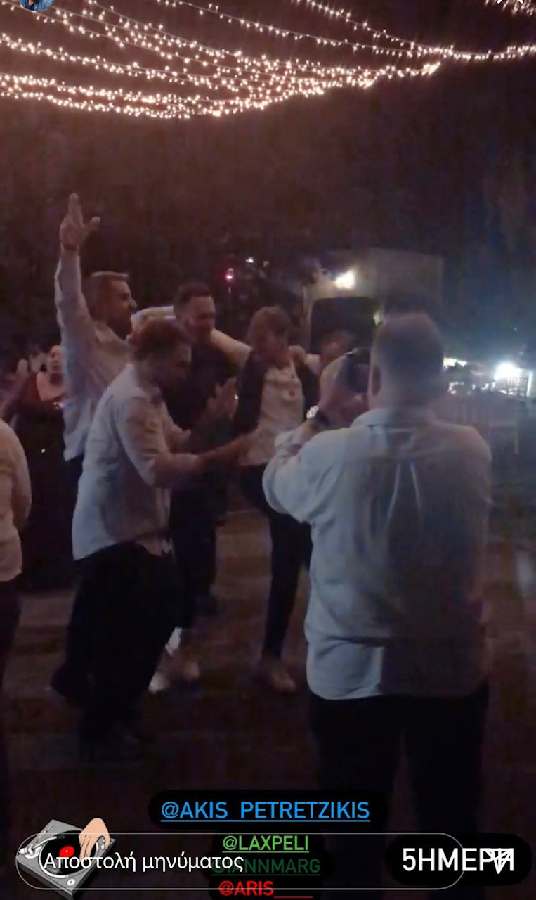 Στη συνέχεια ακολούθησε ένα μεγάλο πάρτι, εκεί όπου οι νεόνυμφοι διασκέδασαν με την καρδιά τους. Το ερωτευμένο ζευγάρι έκανε είσοδο υπό τους ήχους του Star Wars, με την Κωνσταντίνα Παπαμιχαήλ να κρατάει στην αγκαλιά της τον μικρό Αχιλλέα. Σε ένα άλλο στιγμιότυπο απαθανατίζεται ο ξέφρενος χορός του ζευγαριού υπό τους ήχους του Can't Take My Eyes Off You, ενώ στη συνέχεια ο Ακης Πετρετζίκης πήρε το μικρόφωνο και τραγούδησε Ξύλινα Σπαθιά και συγκεκριμένα τον «Βασιλιά της Σκόνης».