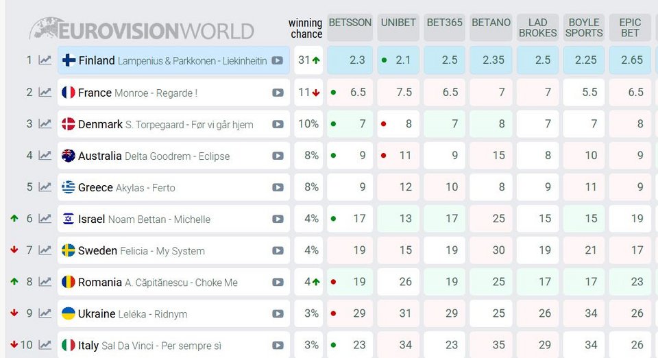 Ακολουθούν η Γαλλία, η Δανία και η Αυστραλία ενώ η Ελλάδα βρίσκετται σαθερά στην 5η θέση, με πιθανότητες νίκης 8%.