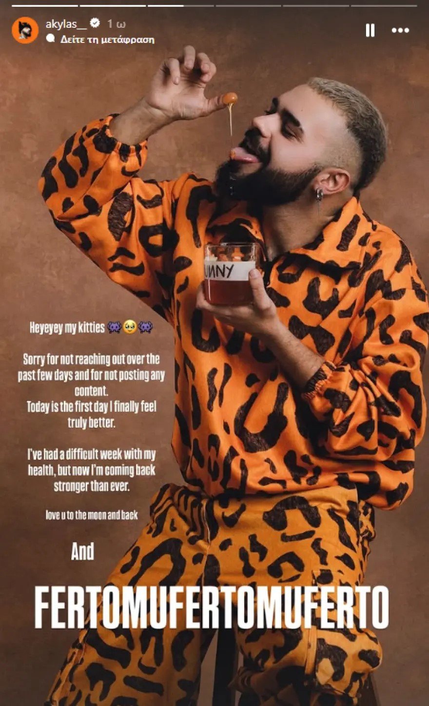 Ο τραγουδιστής έγραψε χαρακτηριστικά: «Συγγνώμη που δεν επικοινώνησα τις τελευταίες ημέρες και που δεν ανέβασα καθόλου περιεχόμενο. Σήμερα είναι η πρώτη μέρα που επιτέλους νιώθω πραγματικά καλύτερα. Πέρασα μια δύσκολη εβδομάδα με την υγεία μου, αλλά τώρα επιστρέφω πιο δυνατός από ποτέ. Σας αγαπώ μέχρι το φεγγάρι και πίσω».