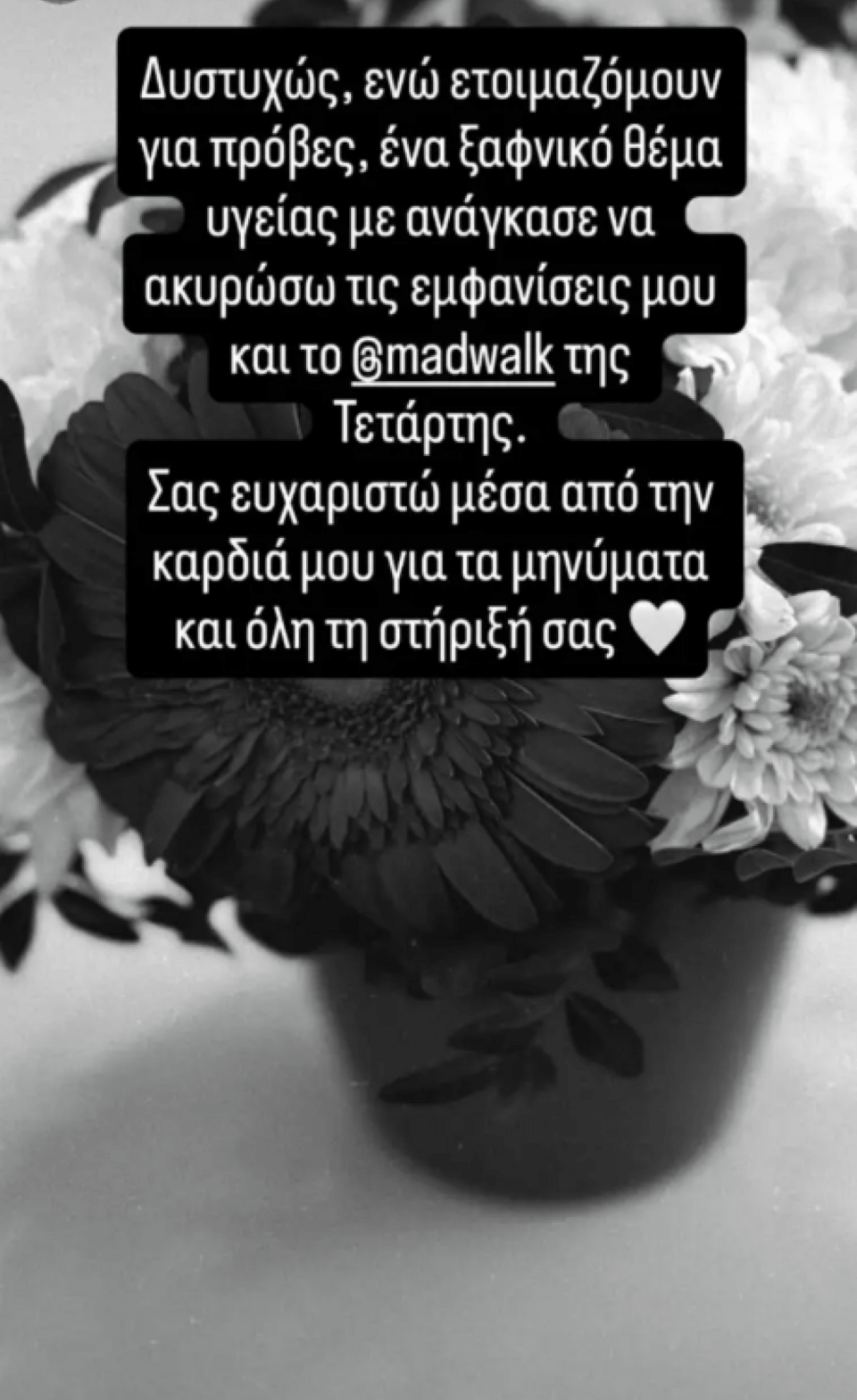 Η Μαρίνα Σάττι, μέσα από ανάρτησή της στο Instagram, εξέφρασε τις ευχαριστίες της για τη στήριξη που λαμβάνει, γράφοντας πως «ένα ξαφνικό θέμα υγείας» την ανάγκασε να ακυρώσει τόσο το MadWalk όσο και τις προγραμματισμένες πρόβες της.