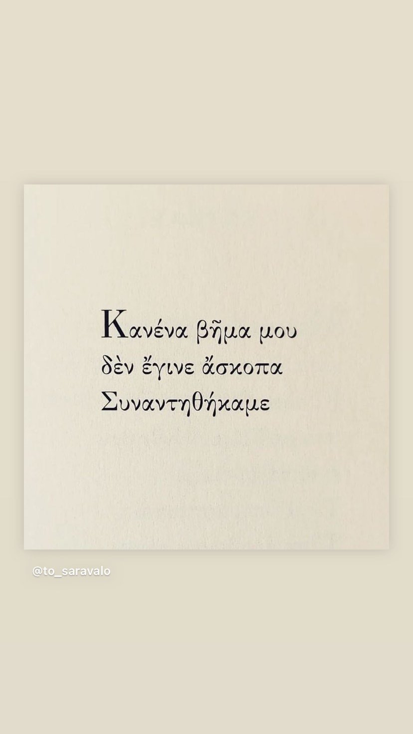 Το βράδυ της Παρασκευής η δημοσιογράφος κοινοποίησε στο Instagram ένα story που έγραφε: «Κανένα βήμα μου δεν έγινε άσκοπα. Συναντηθήκαμε», που αποτελεί στίχο της Κορίνας Καλούδη από τη συλλογή: «Έπρεπε να κλεψω» και συγκίνησε τους ακολουθούς της.