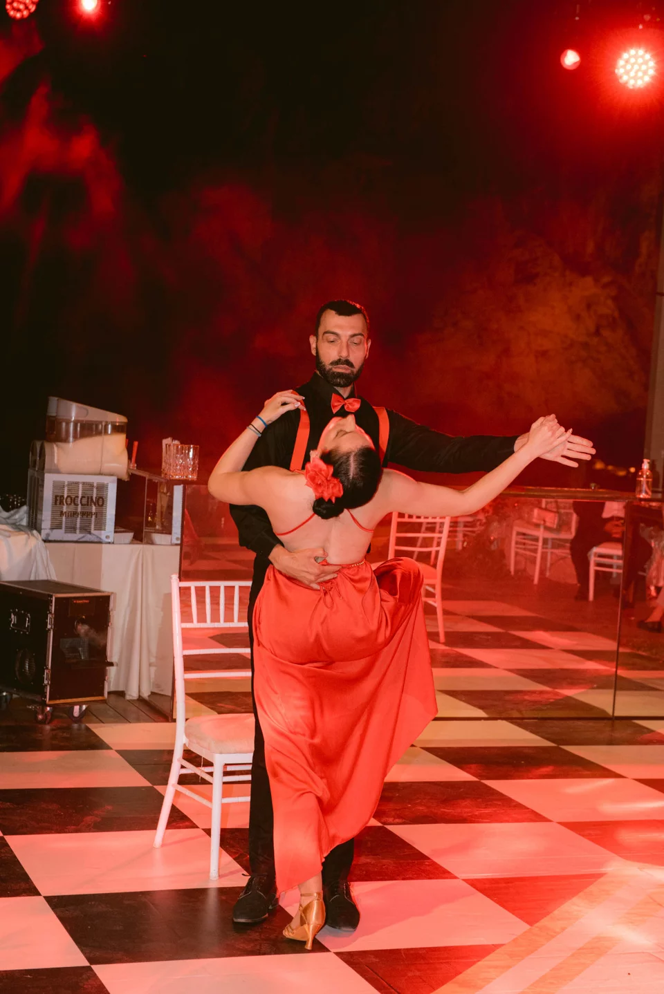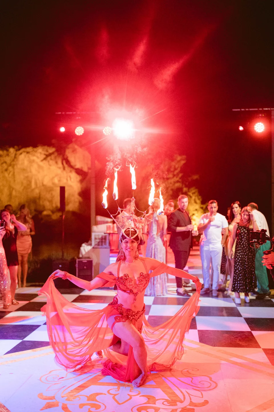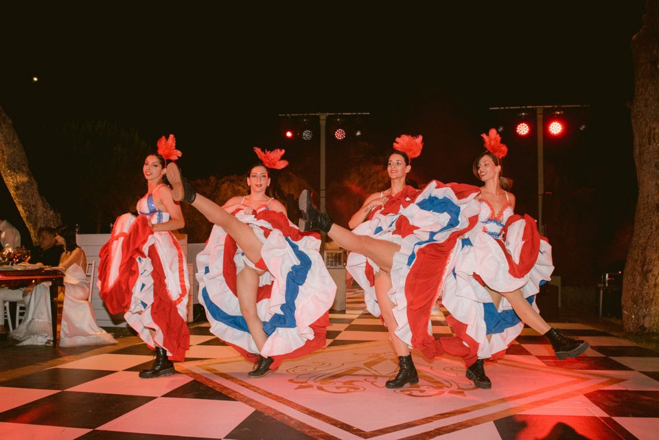 Καλλιτέχνες, φίλοι του ζευγαριού, τραγούδησαν στα γαλλικά και ξεσήκωσαν τους καλεσμένους ενώ κατά τη διάρκεια του δείπνου, χορεύτριες ντυμένες με ρούχα εποχής εμφανίστηκαν στο χώρο της δεξίωσης και παρουσίασαν ένα μοναδικό show.