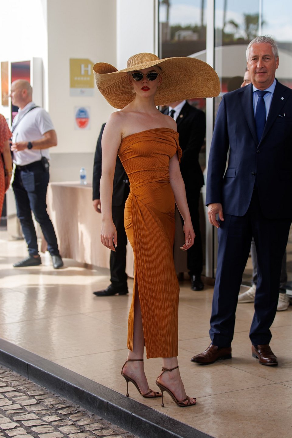 Λίγο πριν ξεκινήσει το Φεστιβάλ στις Κάννες, η Άνια έκανε μια θεαματική άφιξη στη γαλλική Ριβιέρα με ένα πορτοκαλί φόρεμα με έναν ώμο από τη νέα συλλογή της Atlein Paris, με ψηλοτάκουνα πέδιλα και ένα εντυπωσιακό καπέλο με εξαιρετικά φαρδύ γείσο από τον οίκο Jacquemus, που φημίζεται για τα καπέλα του.