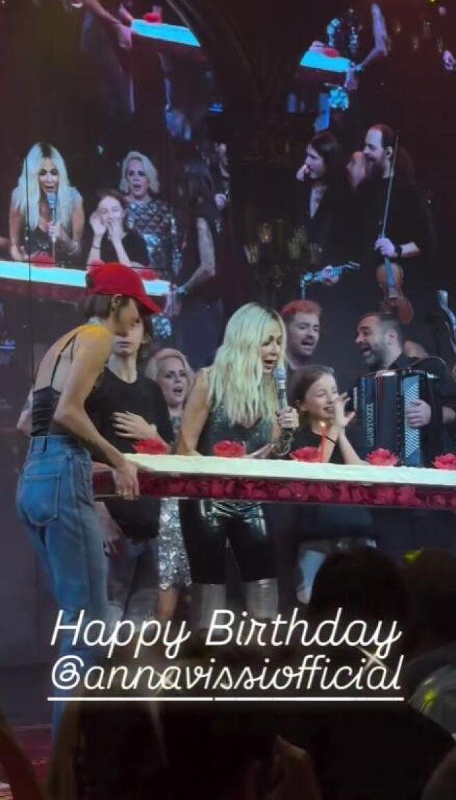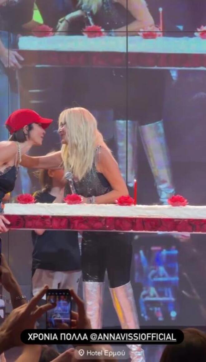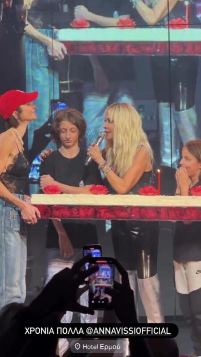 Κατά τη διάρκεια της εμφάνισής της στο Hotel Ermou, το βράδυ της Παρασκευής, η κορυφαία Ελληνίδα σταρ δέχθηκε μια συγκινητική έκπληξη από την κόρη της, Σοφία Καρβέλα, και τα δύο εγγόνια της. Η Σοφία ανέβηκε στη σκηνή μαζί με τους Νίκο και Νέστορα, κρατώντας μια εντυπωσιακή τούρτα στολισμένη με τριαντάφυλλα, προκειμένου να ευχηθούν όλοι μαζί στην Άννα Βίσση.