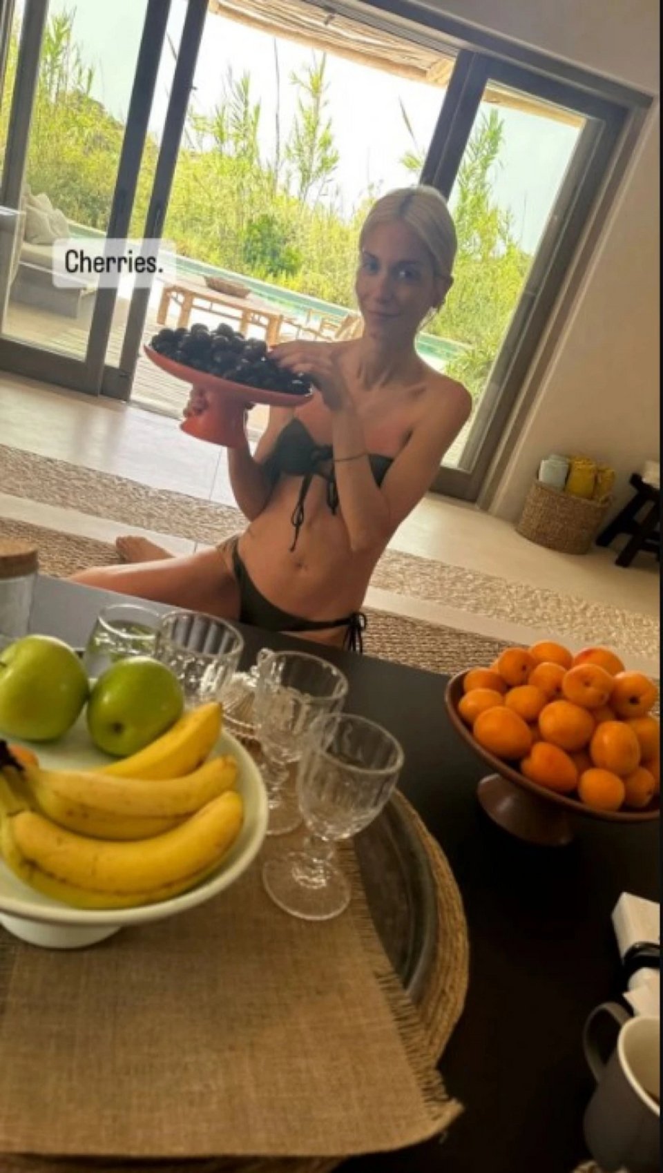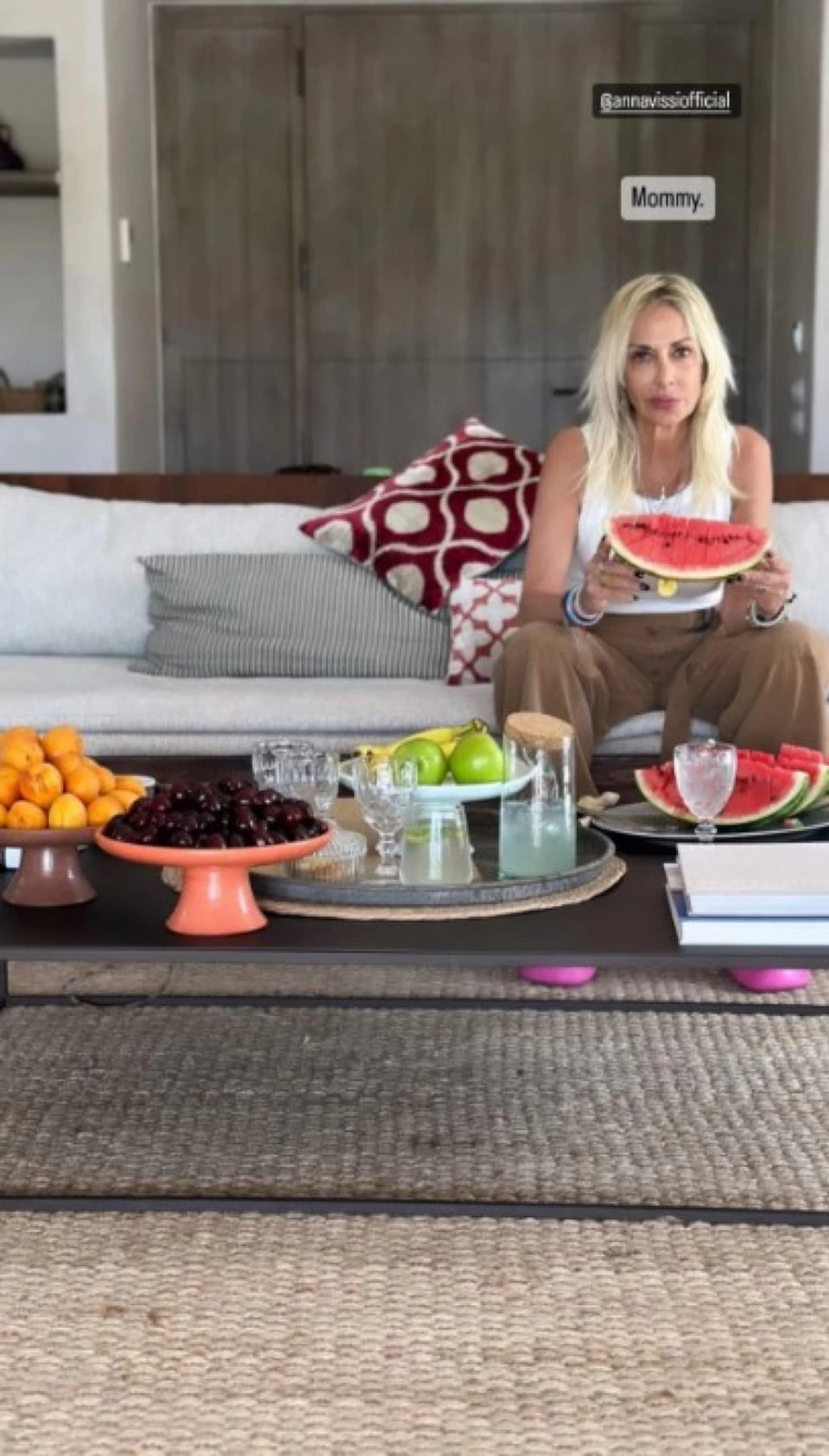 Σε μία από τις φωτογραφίες, η τραγουδίστρια κρατά ένα καρπούζι στο χέρι, ενώ σε ένα άλλο η κόρη της κρατά μια πιατέλα με κεράσια.