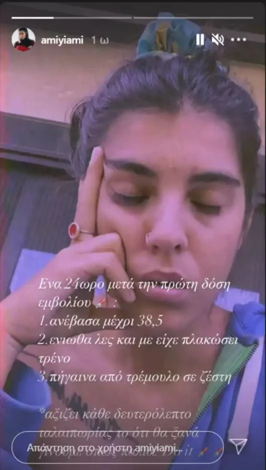 Ύστερα από ένα 24ωρο, έσπευσε να ενημερώσει τους διαδικτυακούς της φίλους για τα συμπτώματα που έχει. «Ανέβασα μέχρι 38,5, Ένιωθα λες και με είχε πλακώσει τρένο. Πήγαινα από τρέμουλο σε ζέστη. Αξίζει κάθε δευτερόλεπτο ταλαιπωρίας το ότι θα γίνουμε ξανά όπως παλιά. Do it», έγραψε στην ανάρτησή της στο Instagram η Άννα Μαρία-Βέλλη.