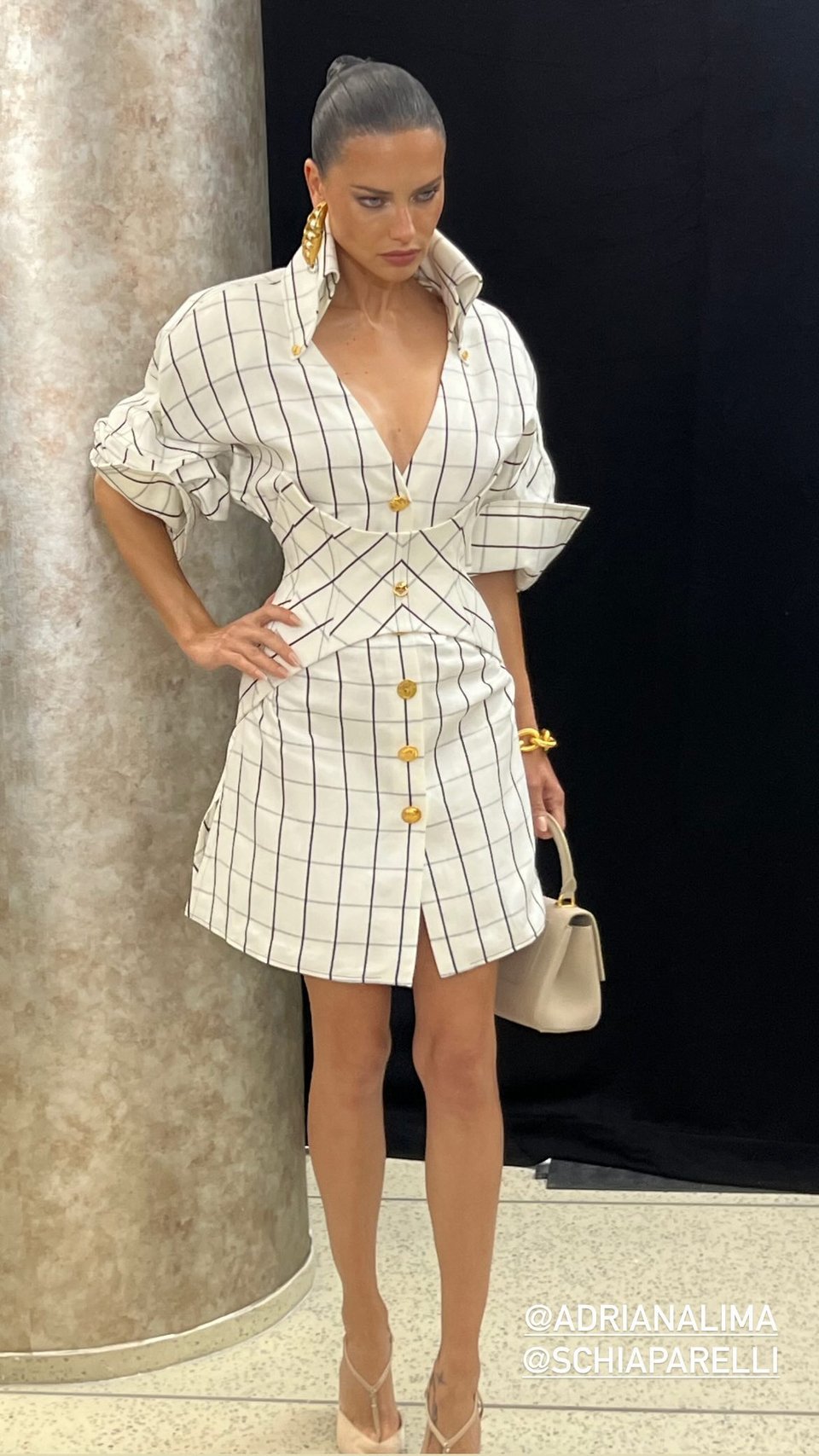Η Λίμα περπάτησε στην πασαρέλα φορώντας ένα άσπρο ριγέ φόρεμα της δεκαετίας του '80 με λεπτομέρειες από κορσέ και χρυσά κουμπιά με την υπογραφή της μάρκας.