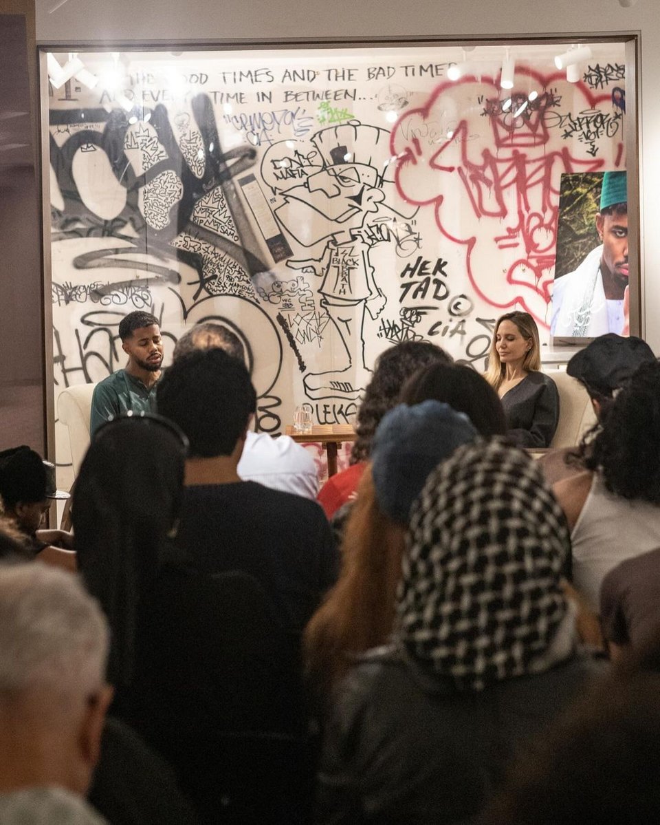 Η ηθοποιός έπαιρνε συνέντευξη από τον Μουσταφά στον εκθεσιακό χώρο του Atelier Jolie, στην Great Jones Street.