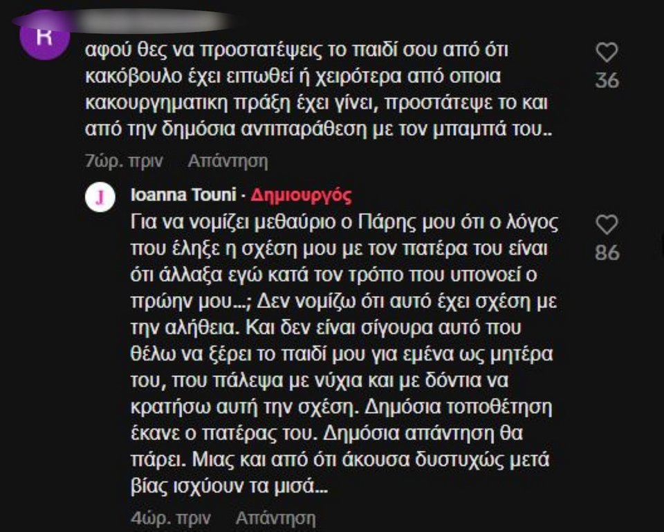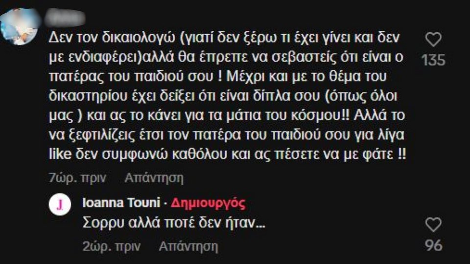 Ειδικότερα, σε σχόλιο που δέχτηκε ότι δεν χρειάζεται να «ξεφτιλίζει» τον πατέρα του παιδιού της, καθώς στο παρελθόν ήταν δίπλα της και την στήριξε, η Ιωάννα Τούνη υποστήριξε ότι κάτι τέτοιο δεν έγινε ποτέ.