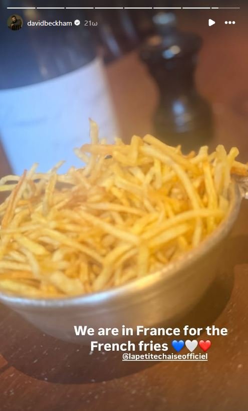 Ο 50χρονος πρώην ποδοσφαιριστής μοιράστηκε στα Insta stories του φωτογραφίες από την επίσκεψή του στο La Petite Chaise στο Παρίσι, όπου βρίσκεται εν μέσω της Εβδομάδας Μόδας αλλά και της βράβευσης της συζύγου του από την υπουργό Πολιτισμού της Γαλλίας.