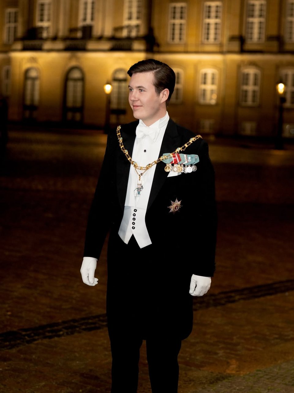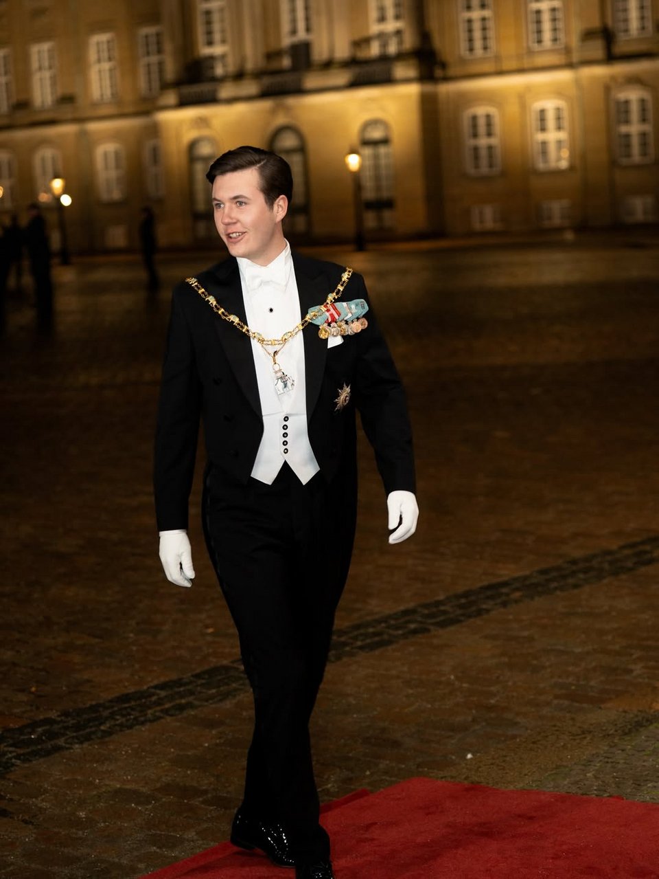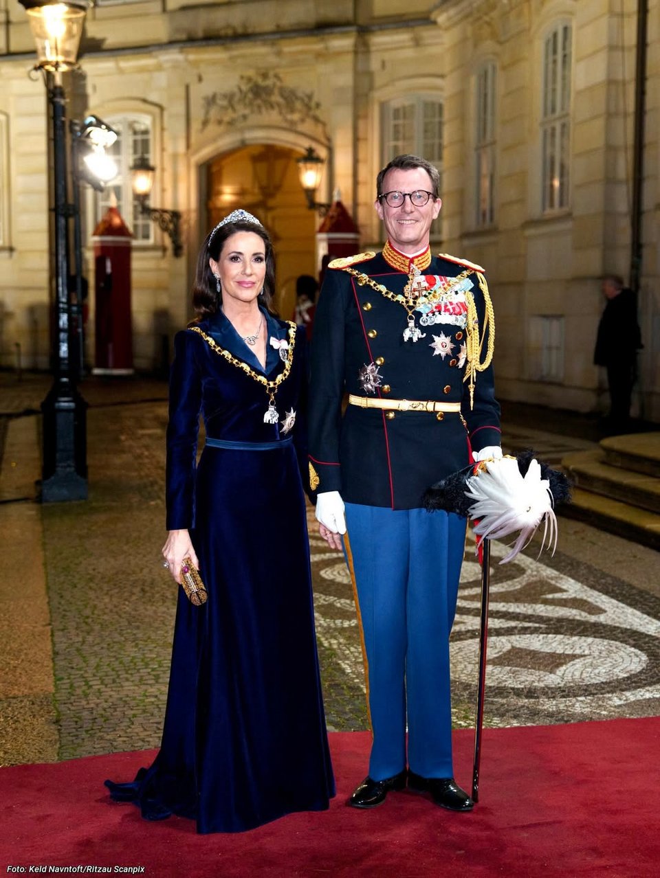 Η πριγκίπισσα Μαρί επέλεξε μια μπλε βελούδινη τουαλέτα, τη Mauboussin Nuit Claire Tiara, σκουλαρίκια με ζαφείρια, καθώς και το Κολάρο και το Αστέρι του Τάγματος του Ελέφαντα.