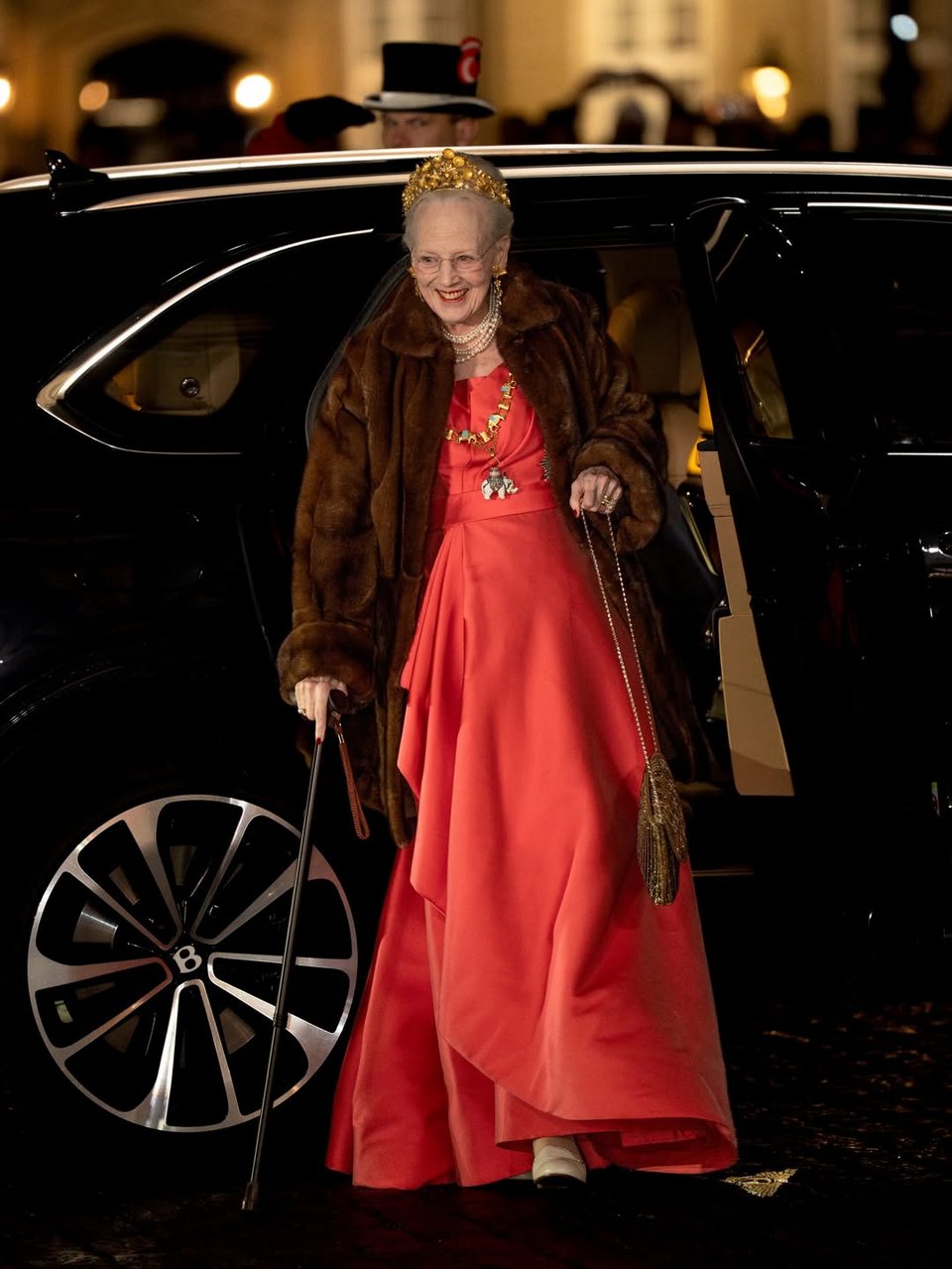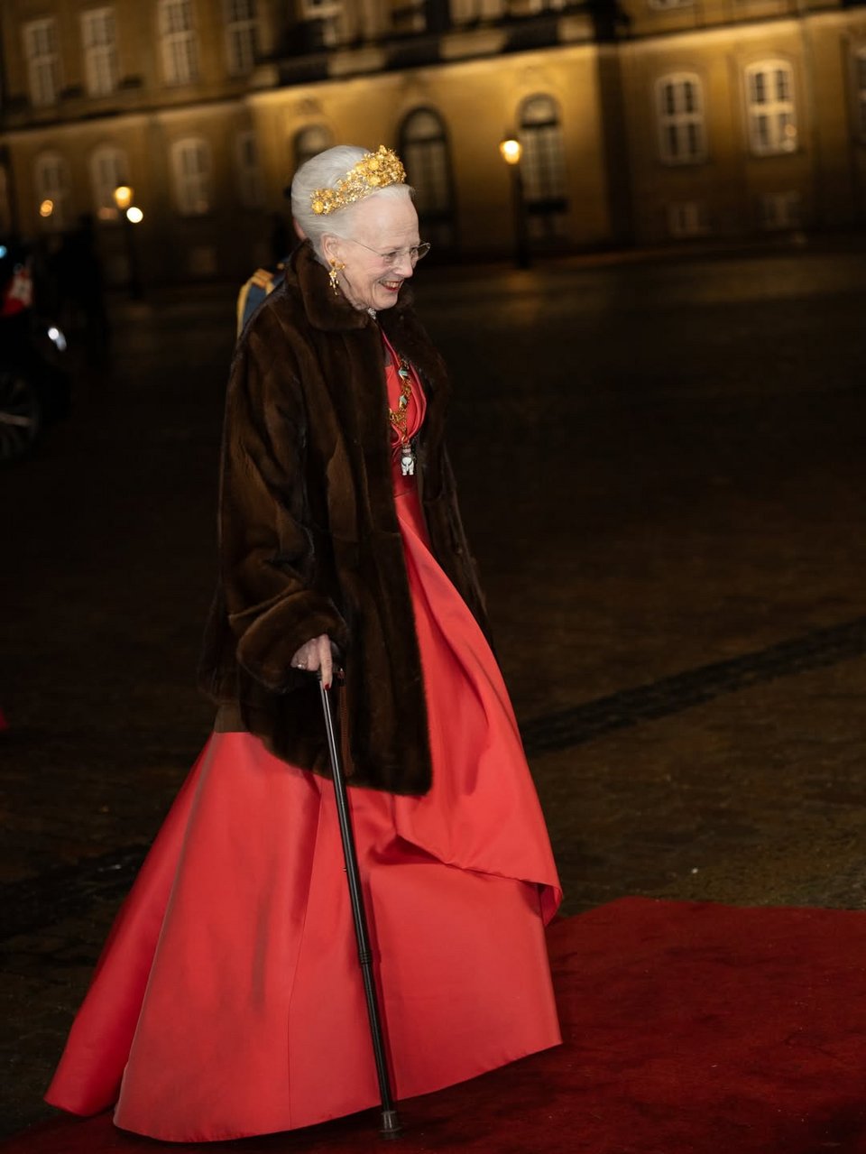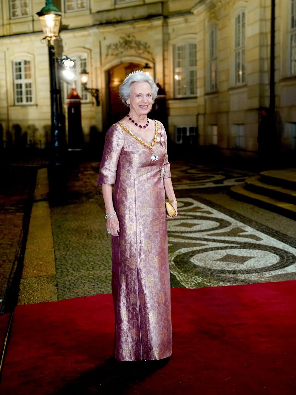 Συμπλήρωσε την εμφάνισή της με το Κολάρο και το Αστέρι του Τάγματος του Ελέφαντα. Η βασίλισσα Μαργκρέτε εμφανίστηκε με τη Nassut Tiara, φορώντας κόκκινο φόρεμα και καφέ γούνα καθώς και το Κολάρο και το Αστέρι του Τάγματος του Ελέφαντα.