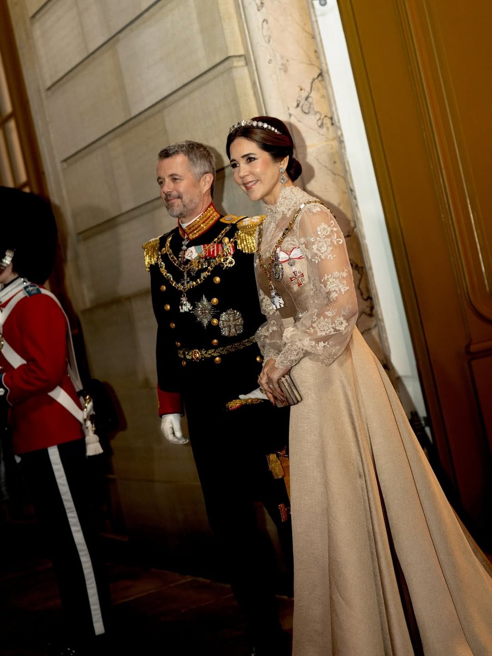 Η βασίλισσα Μαίρη επέλεξε μία χρυσή δημιουργία του Jesper Høvring με λεπτομέρειες από δαντέλα και φόρεσε την εντυπωσιακή Diamond Bandeau Tiara, καθώς και διαμαντένια σκουλαρίκια από τα κοσμήματα του Δανικού Στέμματος.