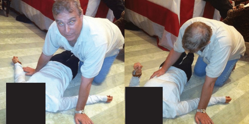 Σε ένα έγγραφο 100 σελίδων με φωτογραφικό υλικό, ο Άντριου Μαουντμπάτεν Γουίνδσορ απεικονίζεται σκυμμένος στα τέσσερα πάνω από μια άγνωστη γυναίκα ενώ σε μια άλλη, ο πρώην δούκας φαίνεται να αγγίζει την κοιλιά της. Στο βάθος διακρίνονται τα πόδια ενός ακόμη αγνώστου ατόμου πάνω σε τραπέζι. Οι εικόνες αυτές, βέβαια, δεν συνοδεύονται από λεζάντες και δεν είναι γνωστό πού τραβήχτηκαν.
