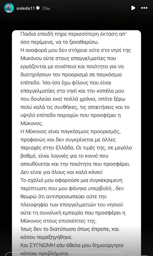 Από την πλευρά του, ο Άρης Σοϊλέδης, έπειτα από την έκταση που πήρε το θέμα, έκανε νέα ανάρτηση στο Instagram όπου ζητά συγγνώμη και ξεκαθαρίζει ότι η αναφορά του δεν στόχευε ούτε στο νησί της Μυκόνου, ούτε στους επαγγελματίες που εργάζονται με συνέπεια και ποιότητα για να διατηρήσουν τον προορισμό σε παγκόσμιο επίπεδο και πως το σχόλιό του αφορούσε μια συγκεκριμένη περίπτωση που του φάνηκε υπερβολή, πως δεν θεωρεί ότι αντιπροσωπεύει ούτε την πλειοψηφία των επαγγελματιών του νησιού ούτε την συνολική εμπειρία που προσφέρει η Μύκονος στους επισκέπτες.