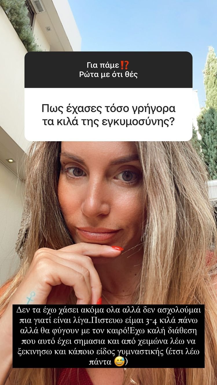 «Δεν τα έχω χάσει ακόμα όλα, αλλά δεν ασχολούμαι πια γιατί είναι λίγα. Πιστεύω είμαι 3-4 κιλά πάνω, αλλά θα φύγουν με τον καιρό! Έχω καλή διάθεση που αυτό έχει σημασία και από χειμώνα λέω να ξεκινήσω και κάποιο είδος γυμναστικής (έτσι λέω πάντα)», απάντησε χαρακτηριστικά η Αθηνά Οικονομάκου.