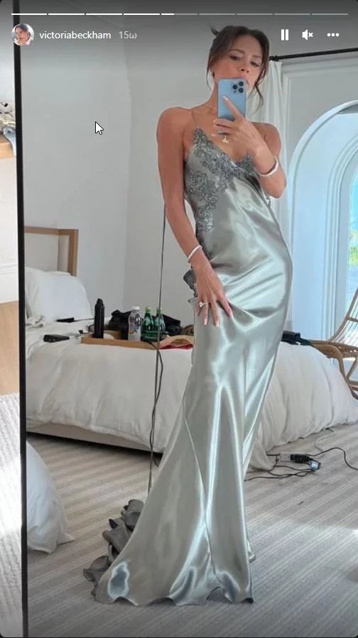 Επιστρέφοντας λοιπόν στο γάμο, η άλλη εκθαμβωτική εμφάνιση ήταν αυτή της Βικτόρια. Θυμίζοντας εποχές του θρυλικού Studio 54, η Βρετανίδα σχεδιάστρια μόδας φόρεσε ένα μάξι, σέξι φόρεμ , του οποίου το ύφασμα ήταν εμπνευσμένο από την αντανάκλαση του σεληνόφωτος στον ωκεανό τη νύχτα, το εφέ ήταν μεταλλικό και σχεδόν σαν ρέων υγρό.