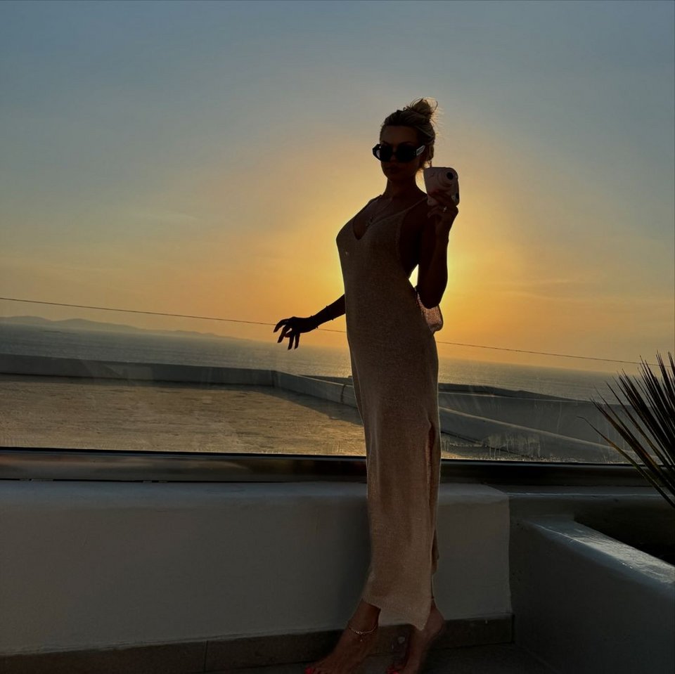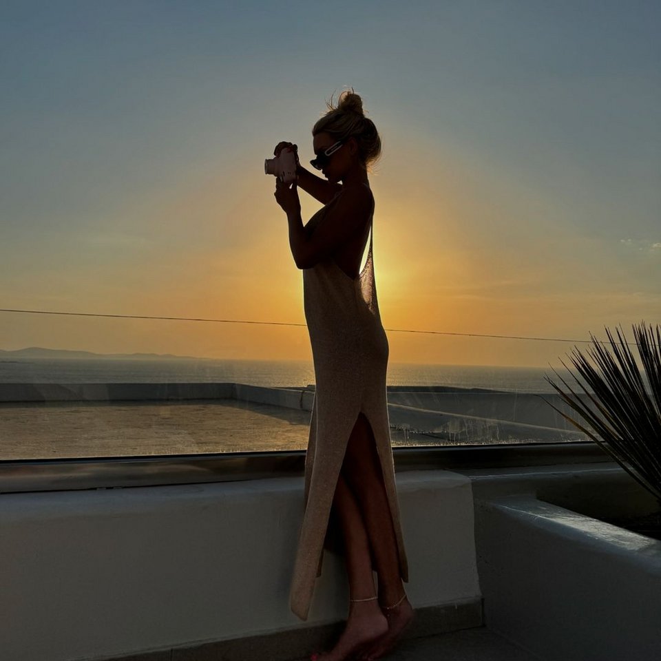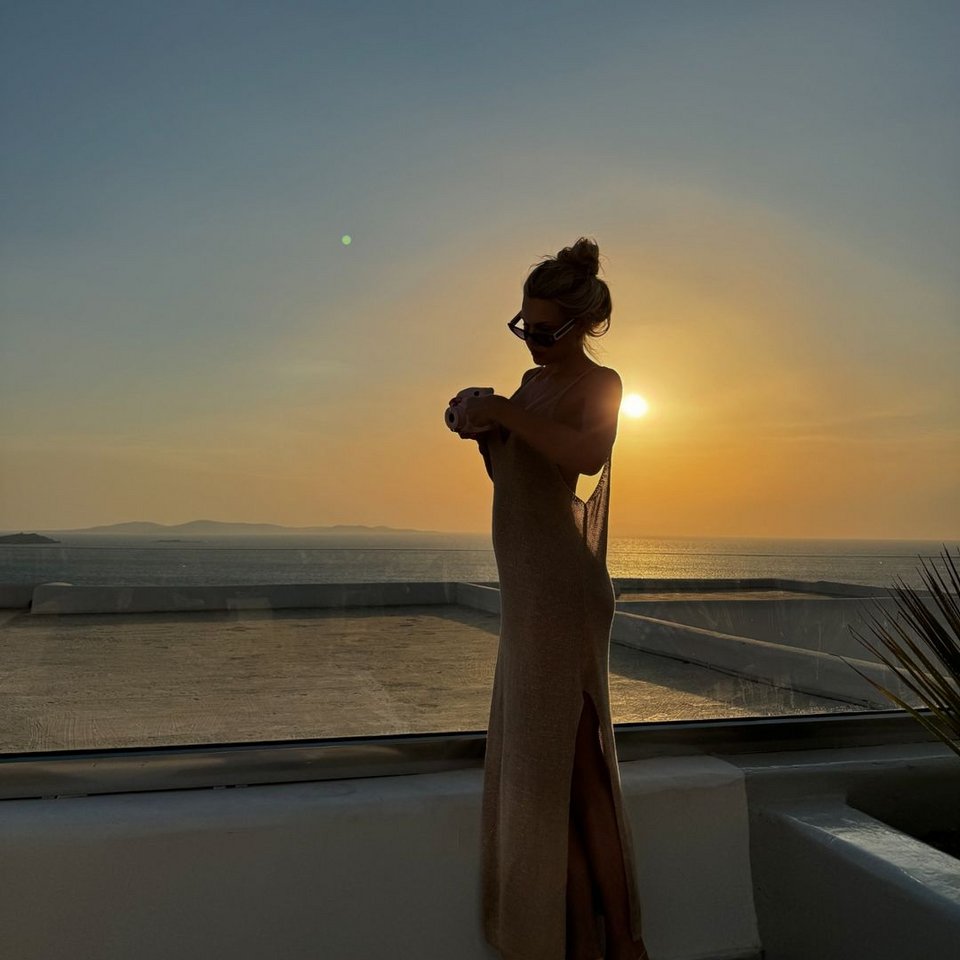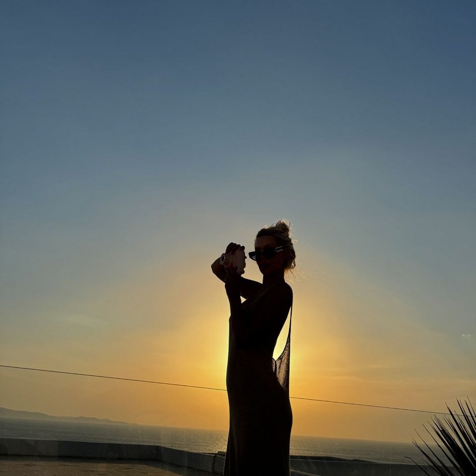 Η ηθοποιός πόζαρε από ένα μπαλκόνι με θέα το ηλιοβασίλεμα του νησιού, κρατώντας παράλληλα μια φωτογραφική μηχανή στα χέρια της.