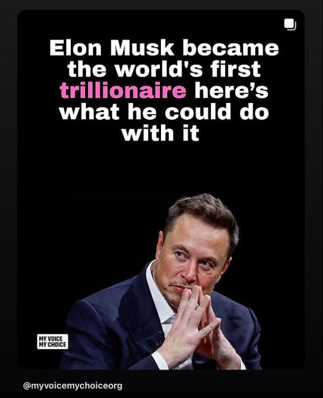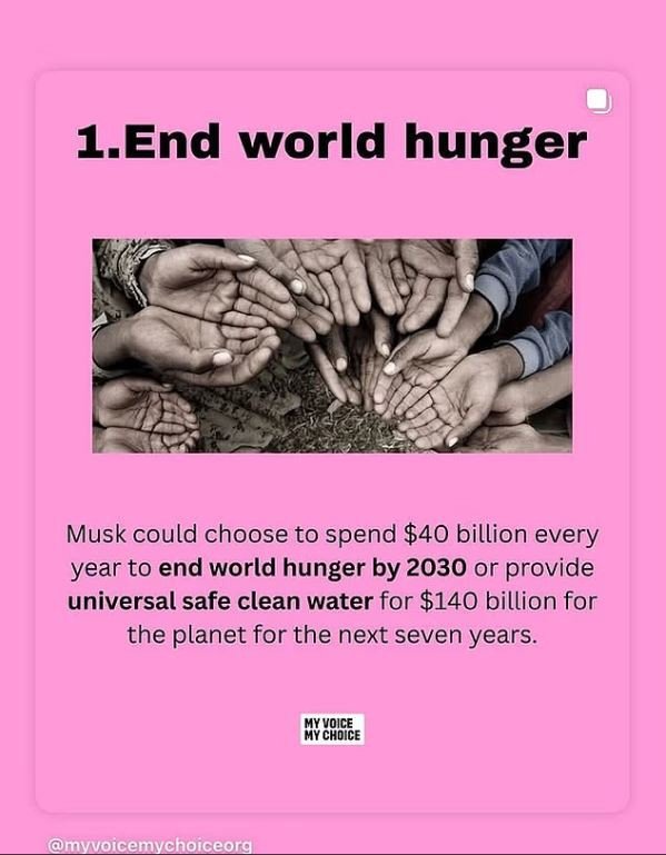 Κάθε διαφάνεια περιέγραφε τι θα μπορούσε θεωρητικά να χρηματοδοτήσει ο Έλον Μασκ με την τεράστια περιουσία του. Για παράδειγμα, ένα γραφικό υποστήριζε ότι θα μπορούσε να ξοδέψει 40 δισεκατομμύρια δολάρια τον χρόνο για να τερματίσει την παγκόσμια πείνα έως το 2030, ενώ ένα άλλο ανέφερε ότι 140 δισεκατομμύρια δολάρια θα μπορούσαν να εξασφαλίσουν καθαρό πόσιμο νερό για ολόκληρο τον πλανήτη για επτά χρόνια.