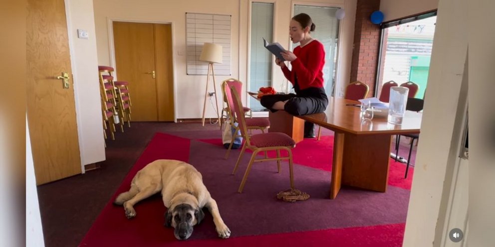 Η Στόουν κάθεται σταυροπόδι πάνω σε ένα γραφείο και διαβάζει τον μόνολογό της από μια σκηνή της ταινίας, ενώ στο πάτωμα είναι ξαπλωμένος ένας μεγαλόσωμος σκύλος.