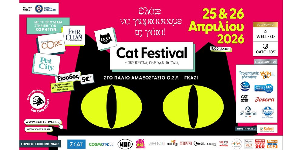 Μετά την εντυπωσιακή επιτυχία της πρώτης διοργάνωσης, το Cat Festival επιστρέφει για δεύτερη χρονιά, ακόμη πιο μεγάλο, ακόμη πιο γατο-γεμάτο και ακόμη πιο τρυφερό! Το Σάββατο 25 και την Κυριακή 26 Απριλίου 2026 από τις 11:00 έως τις 22:00, το Παλιό Αμαξοστάσιο - ΟΣΥ στο Γκάζι μετατρέπεται ξανά σε σημείο συνάντησης για γατόφιλους, οικογένειες, δημιουργούς και ανθρώπους που θέλουν να γνωρίσουν καλύτερα αυτά τα ξεχωριστά πλάσματα.