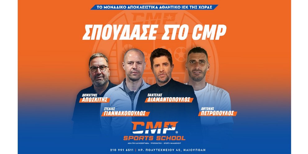 Το CMP Sports School αποτελεί ένα πρότυπο αθλητικό εκπαιδευτικό ίδρυμα, σχεδιασμένο με στόχο να προσφέρει αναβαθμισμένες υπηρεσίες εκπαίδευσης σε καίριους τομείς της σύγχρονης αθλητικής βιομηχανίας: Προπονητική (Ποδόσφαιρο & Μπάσκετ), Αθλητική Δημοσιογραφία, Sports Management και Personal Training.