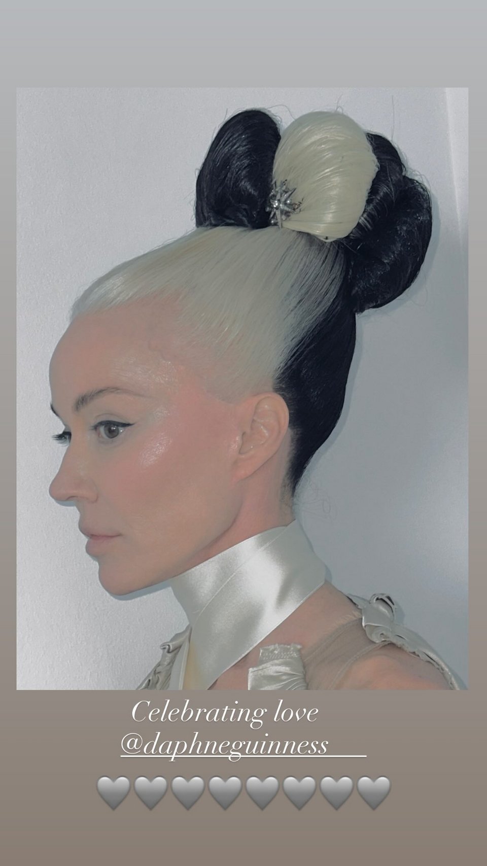 Είχε τα μαλλιά της πιασμένα ψηλά σε έναν ιδιαίτερο κότσο, ενώ το φόρεμά της, όσο διακρίνεται, ήταν ασημένιο, μακρύ, με high neck κορδέλα γύρω από τον λαιμό.