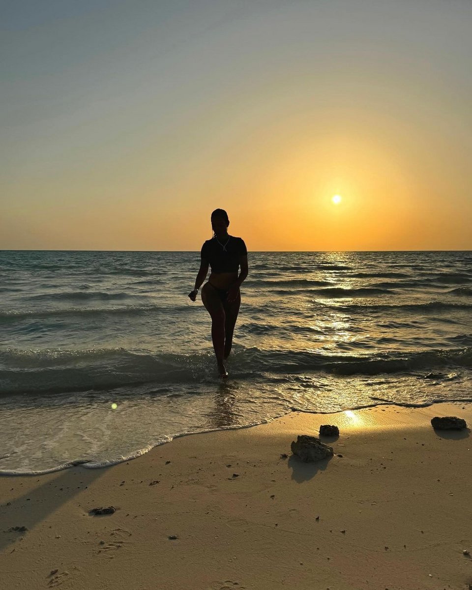 Στα στιγμιότυπα που μοιράστηκε, την βλέπουμε να φορά ένα σέξι μπικίνι και ακριβά κοσμήματα και να απολαμβάνει τη θάλασσα σε μια ατελείωτη, αμμώδη παραλία.