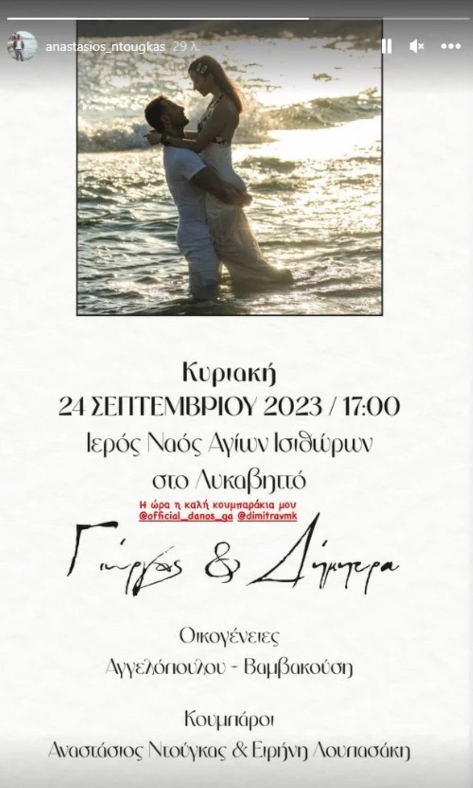 Η είδηση του επικείμενου γάμου του ζευγαριού έγινε γνωστή την Τρίτη, 5/9, όταν ο κουμπάρος τους, ο δικηγόρος Αναστάσιος Ντούγκας, «ανέβασε» story στο Instagram, με το προσκλητήριο γάμου.