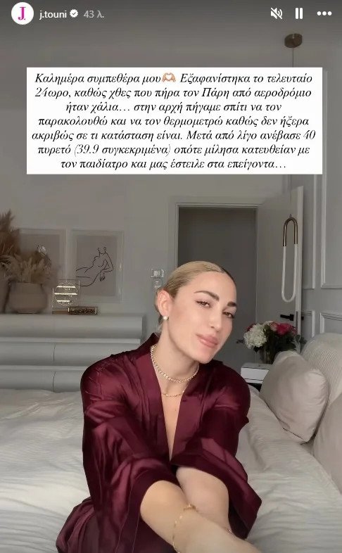 «Χθες σου είπα ότι θα πήγαινα στο αεροδρόμιο να πάρω τον Παρούλη, τον οποίο Παρούλη παρέλαβα χάλια. Το μωρό είχε πυρετό, βασικά απορώ γιατί πέταξε, αλλά δεν θα μείνουμε εκεί πέρα» λέει στο βίντεό της η Ιωάννα Τούνη.