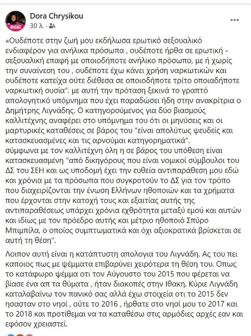 «Ας του πει κάποιος πως με ψέματα επιβαρύνει χειρότερα τη θέση του. Όπως το κατάφωρο ψέμα ότι τον Αύγουστο του 2015, που φέρεται να βίασε ένα από τα θύματα, ήταν διακοπές στην Ιθάκη. Κύριε Λιγνάδη, καταλαβαίνω τον πανικό σας, αλλά έχω στοιχεία ότι το 2015 δεν ήσασταν στο νησί, ούτε το 2016, ήρθατε στο νησί μου το 2017 και το 2018 και προτίθεμαι να τα καταθέσω στις αρμόδιες αρχές εάν και εφόσον χρειαστεί» έγραψε, μεταξύ άλλων, η Δώρα Χρυσικού.