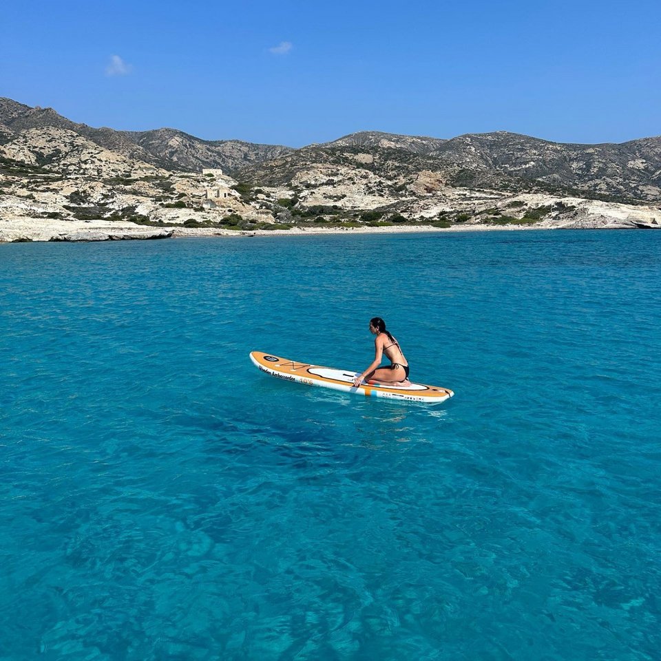 Στα σχετικά φωτογραφικά καρέ, η εντυπωσιακή τραγουδίστρια καταγράφεται, μεταξύ άλλων, σε σανίδα SUP στα βαθυγάλανα νερά, με τη σιλουέτα της να εντυπωσιάζει.