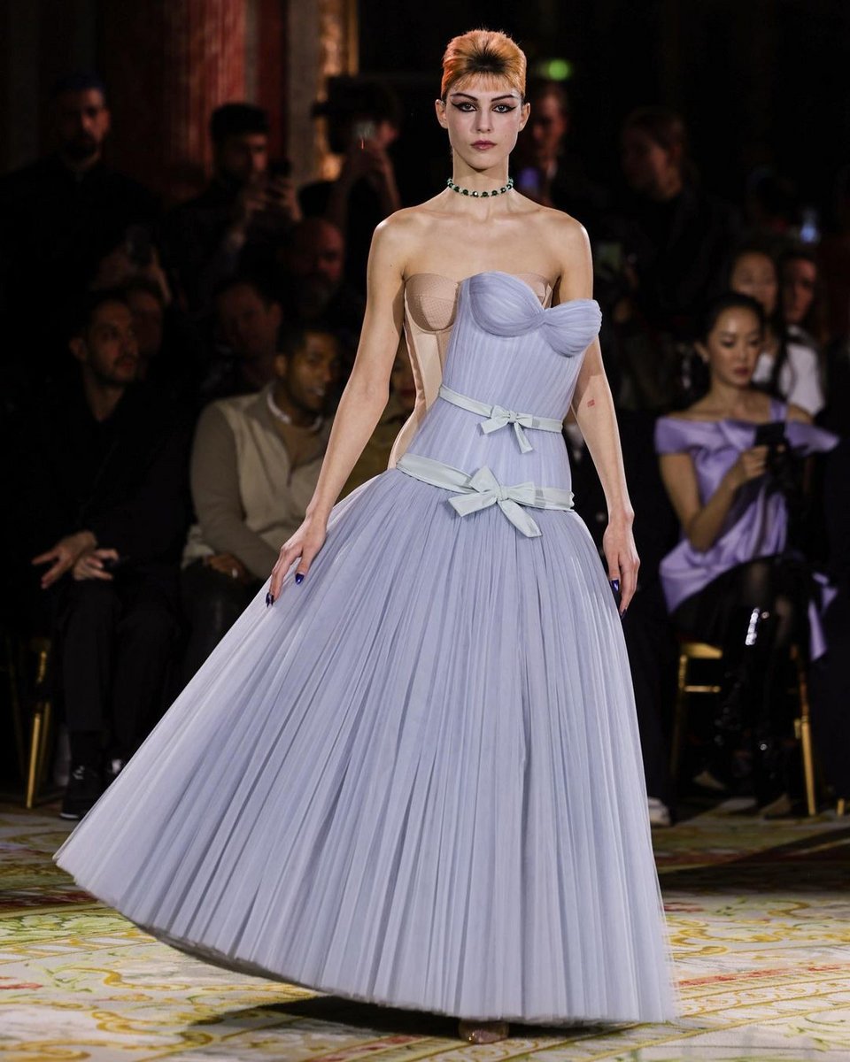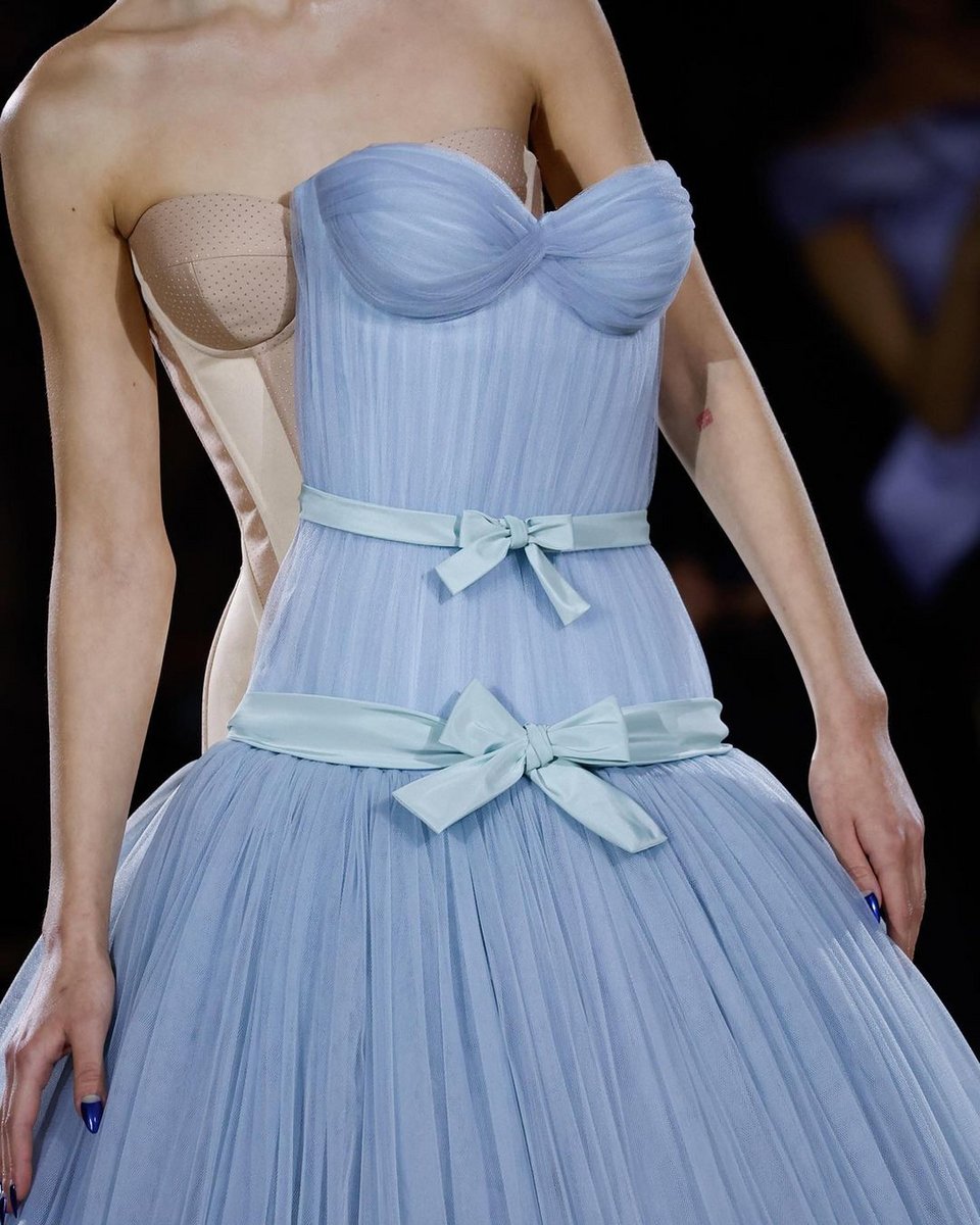 Το διάσημο brand θέλησε να μας προκαλέσει να αμφισβητήσουμε το πώς «πρέπει» να φοριούνται αυτά τα παραδοσιακά και παραμυθένια φορέματα, ενώ, παράλληλα, παίζει θρασύτατα με την ιδέα της αποδόμησης, αποκαλύπτοντας τα εσώρουχα με κορσέ κάτω από τα εκτός σώματος φορέματα.