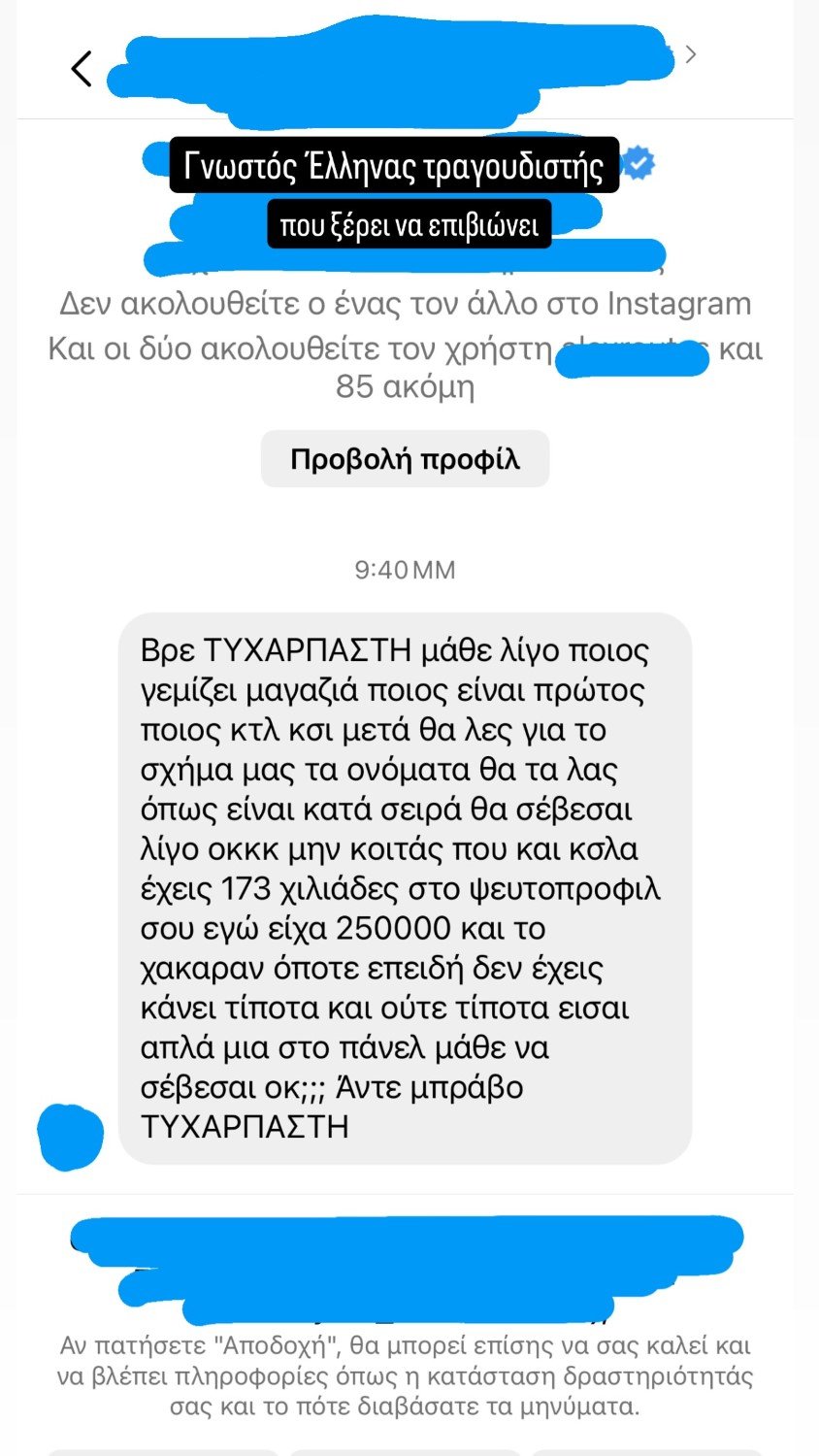 Συγκεκριμένα, η γνωστή YouTuber και παρουσιάστρια, που στη νέα τηλεοπτική σεζόν που διανύουμε συμμετέχει στην εκπομπή «Weekenders», δημοσίευσε τη Δευτέρα, 23/9, ένα story, με το επιθετικό μήνυμα που δέχτηκε από γνωστό Έλληνα τραγουδιστή, χωρίς να αποκαλύπτει το όνομά του.