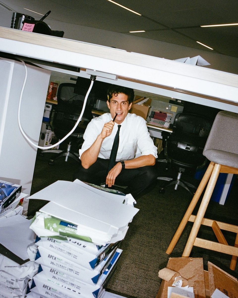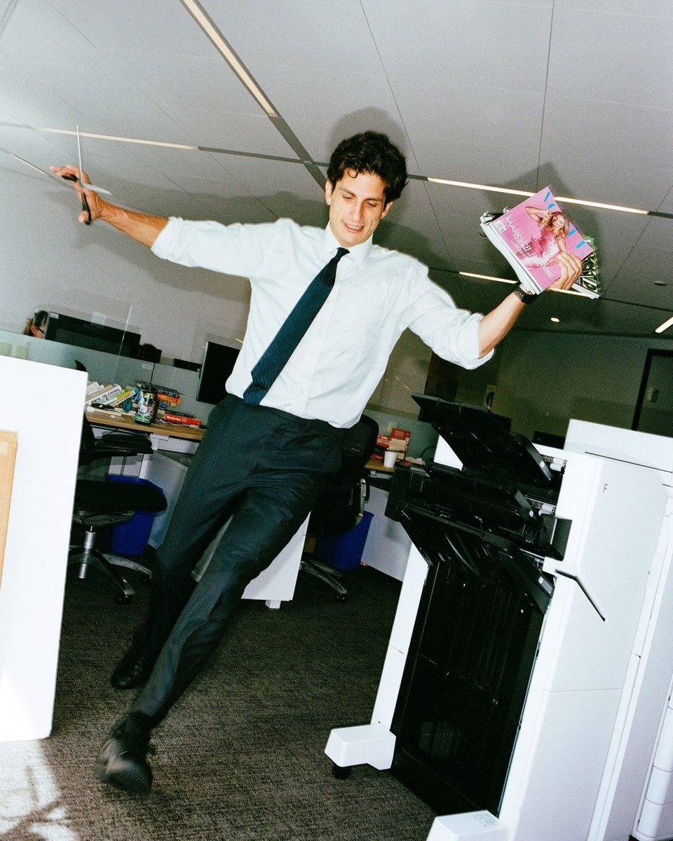 Η Vogue μοιράστηκε φωτογραφίες στο Instagram με τον Σλόσμπεργκ να κυκλοφορεί γύρω από το νέο του γραφείο και οι θαυμαστές κατέκλυσαν αμέσως τα social media για να μιλήσουν για την εμφάνισή του.