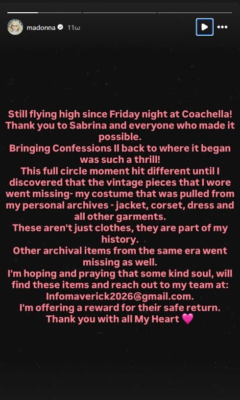 Το σετ αυτό έκτοτε έχει εξαφανιστεί και η Μαντόνα δημοσίευσε ένα story στο Instagram, προσφέροντας αμοιβή για την επιστροφή των αντικειμένων. Όπως έγραψε: «Ακόμη πετάω στα σύννεφα από το βράδυ της Παρασκευής στο Coachella! Ευχαριστώ τη Σαμπρίνα και όλους όσοι το έκαναν δυνατό. Το να επιστρέψω με το Confessions II εκεί όπου όλα ξεκίνησαν ήταν μια μοναδική εμπειρία. Αυτή η στιγμή ολοκλήρωσης του κύκλου είχε άλλη αίσθηση, μέχρι που ανακάλυψα ότι τα vintage κομμάτια που φορούσα εξαφανίστηκαν -το κοστούμι μου από το προσωπικό μου αρχείο- σακάκι, κορσές, φόρεμα και όλα τα υπόλοιπα ρούχα. Δεν είναι απλώς ρούχα, είναι μέρος της ιστορίας μου. Εξαφανίστηκαν και άλλα αρχειακά αντικείμενα από την ίδια περίοδο. Ελπίζω και προσεύχομαι κάποιος καλός άνθρωπος να τα βρει και να επικοινωνήσει με την ομάδα μου. Προσφέρω αμοιβή για την ασφαλή επιστροφή τους. Σας ευχαριστώ από καρδιάς».