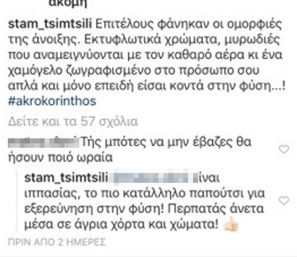 Η Σταματίνα Τσιμτσιλή δεν δίστασε να απαντήσει δημόσια, γράφοντας χαρακτηριστικά: «Οι μπότες είναι ιππασίας, το πιο κατάλληλο παπούτσι για εξερεύνηση στη φύση. Περπατάς άνετα μέσα σε άγρια χόρτα και χώματα».